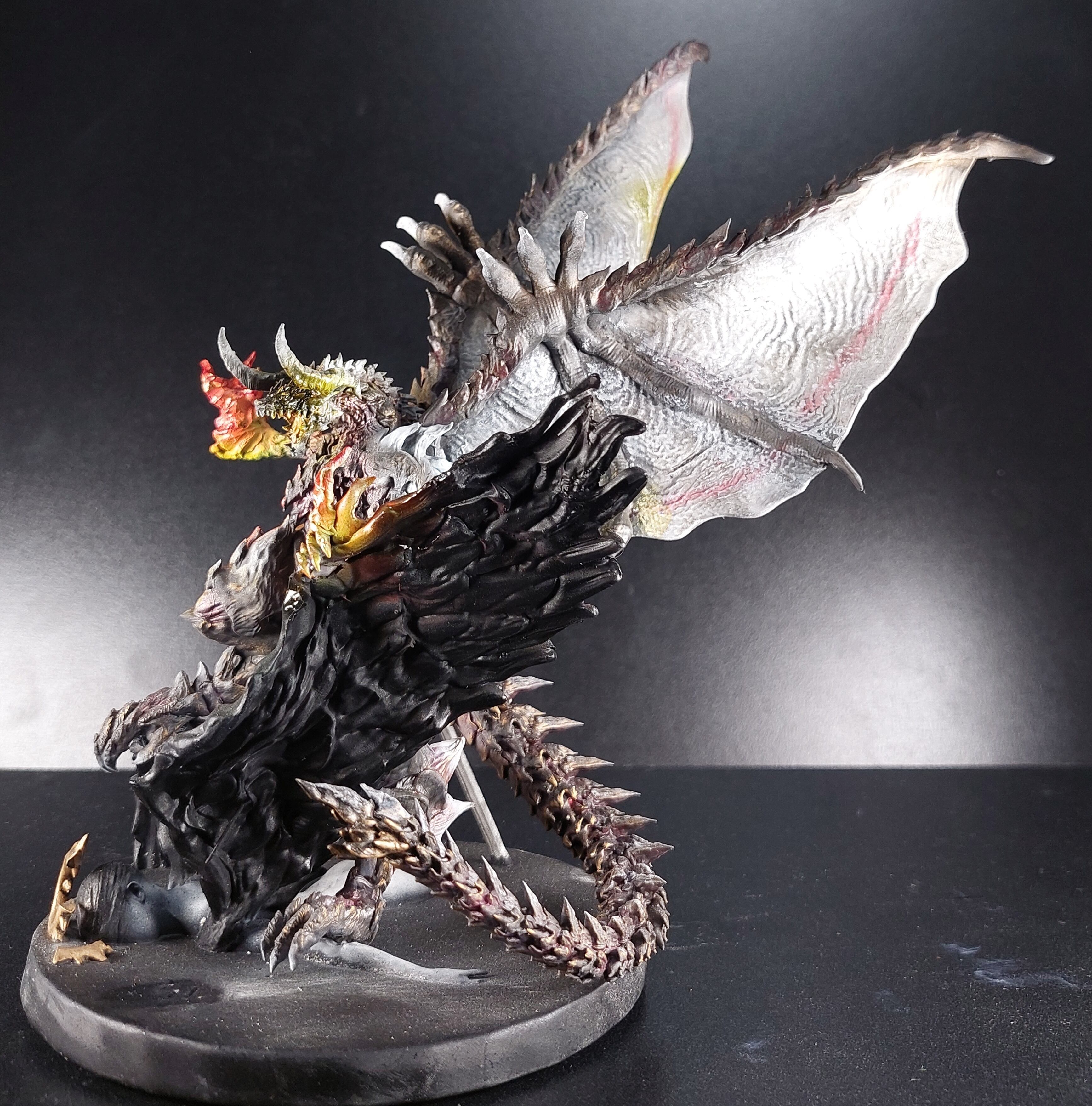 全身に刻まれた精密なディテール、巨大な翼の繊細な表現、そして力強さを感じさせるポージング。神々と相対する竜王の威厳を余すところなく再現しました。さらに、台座には戦いの余韻を感じさせる装飾が施され、物語性を高めています。